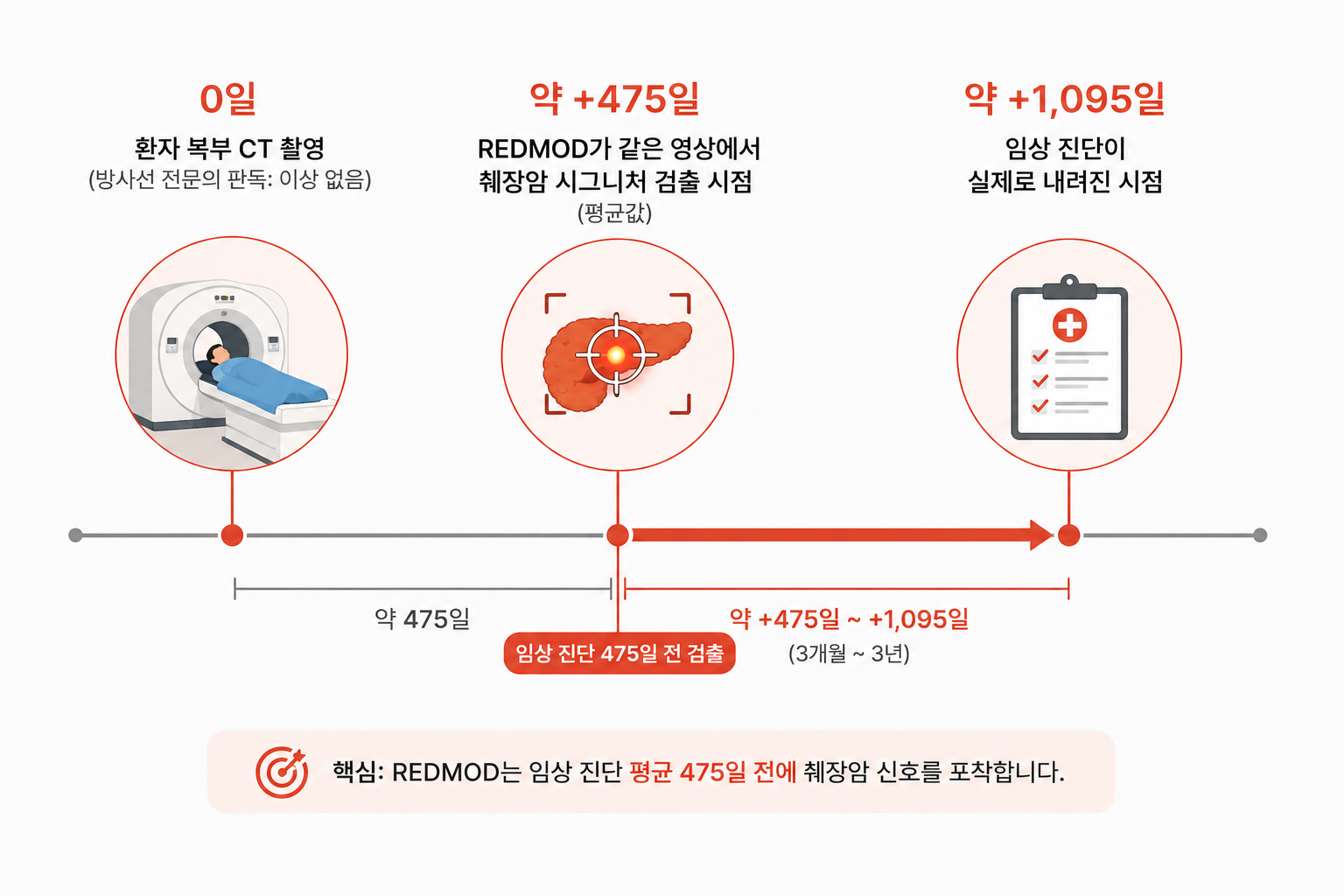 REDMOD는 이 영상에서 임상 진단 평균 475일 전에 전임상 췌관선암의 텍스처 시그니처를 검출했다. 약 1년 3개월 정도 일찍 잡은 셈이다.